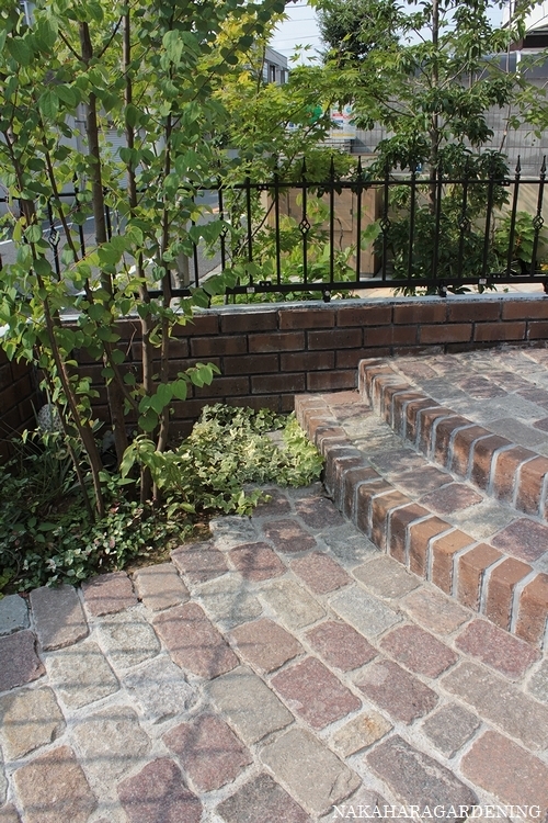 ①玄関アプローチには、アンティークの石を敷きつめて。アンティークレンガの塀と石は、種類も色も、何種類もある中から、奥様が吟味して選びました。