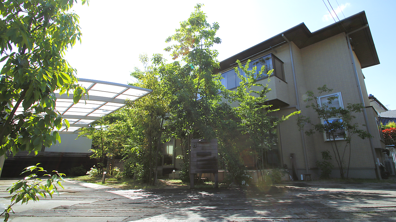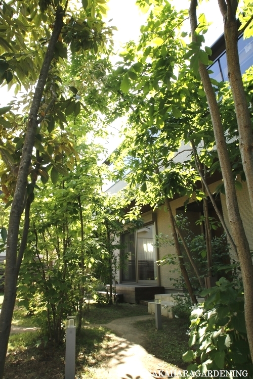 テラスに木陰をつくるやさしい高木類。風もしっかり通り抜けるます