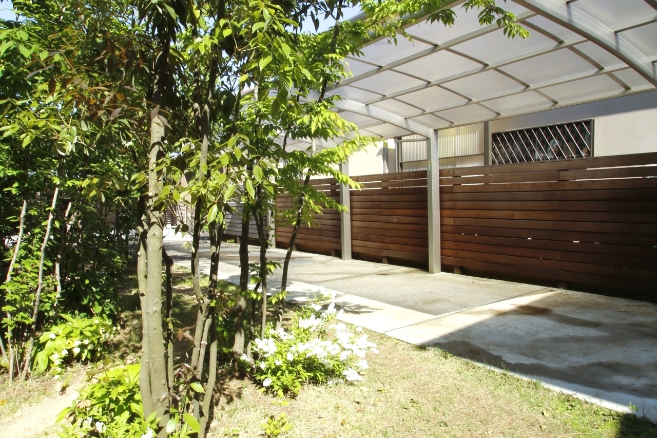 ウッドフェンスとカーポートも植物と馴染む自然な雰囲気に。